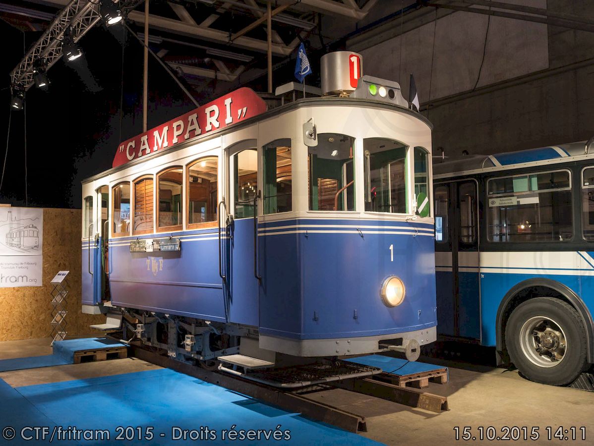 Le tram 1 de 1897 est la toute première motrice du tramway fribourgeois. Et aussi la dernière pièce arrivée dans la collection du CTF. Elle a servi sur le réseau fribourgeois jusqu’au dernier jour d’exploitation, soit durant 68 ans ! Contraint de s’en séparer pour des raisons de place, le musée parisien AMTUIR qui l’a préservée et restaurée nous l’a cédée en 2014. En très bel état de présentation, elle représente l’élément phare de la collection du CTF et illustre désormais le logo de l’association.